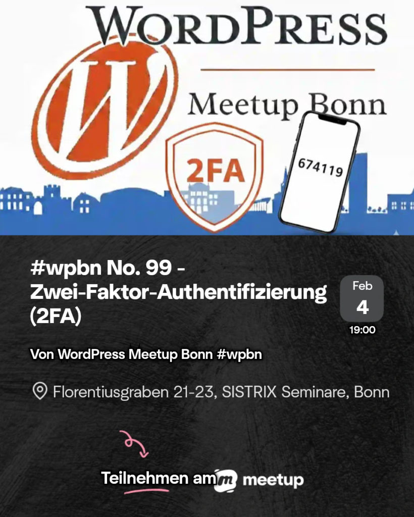 Die Präsenz-Treffen für die WordPress Community in Bonn und Umgebung finden normalerweise jeden 2. Monat (gerade Monate), am ersten Mittwoch, ab 19:00 Uhr im SISTRIX Seminar-Center statt.